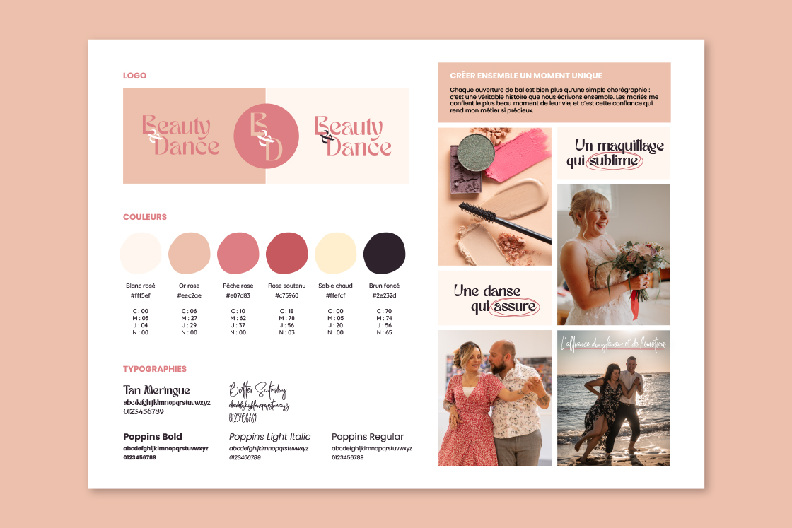 J’ai accompagné Clara à retravailler son message. Ensemble nous avons déterminé les dénominateurs communs entre la danse et le maquillage. Les deux prestations s’adressent aux futurs marié avec la promesse d’un gain de confiance en soi à travers une ouverture de bal maîtrisée et d’un maquillage réussi. Glamour, fun et confiance en soi résument l’expérience Beauty & Dance.