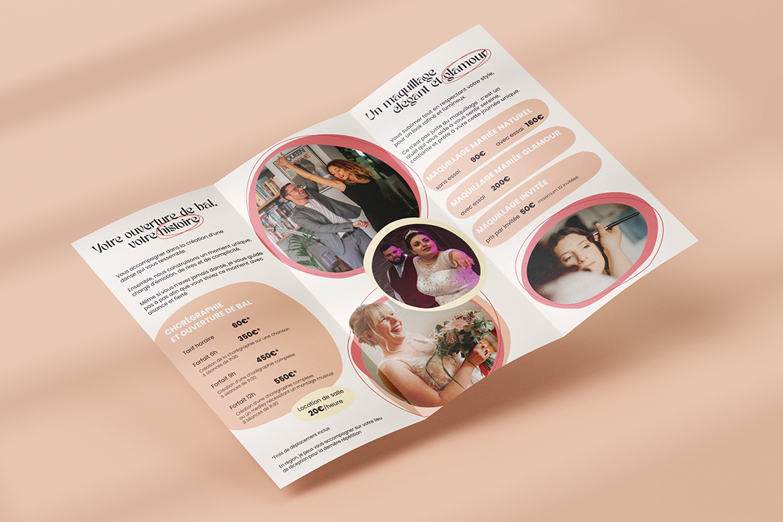 j’ai conçu un roll up qui attire l'oeil sur le stand de Clara et résume son activité en quelques mots. Ainsi qu’un dépliant pour plus d'informations sur les 2 prestations et leurs tarifs. Les photos des futurs mariés pendant leur préparation présentent l’accompagnement apporté par Clara jusqu’au jour J.