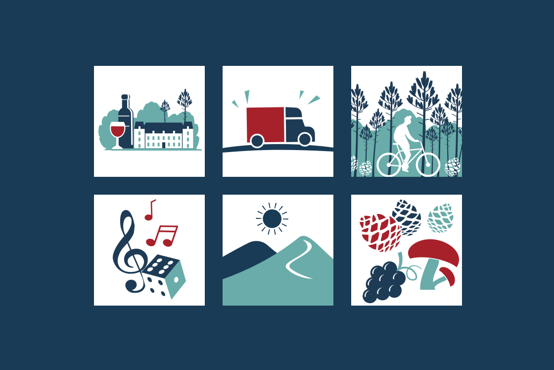 Les illustrations représentent les différentes activitées proposées tout au long de l’année dans la commune. Chaque illustration est utilisable individuellement. Les couleurs utilisées sont celles de la charte de Médoc Plein Sud.