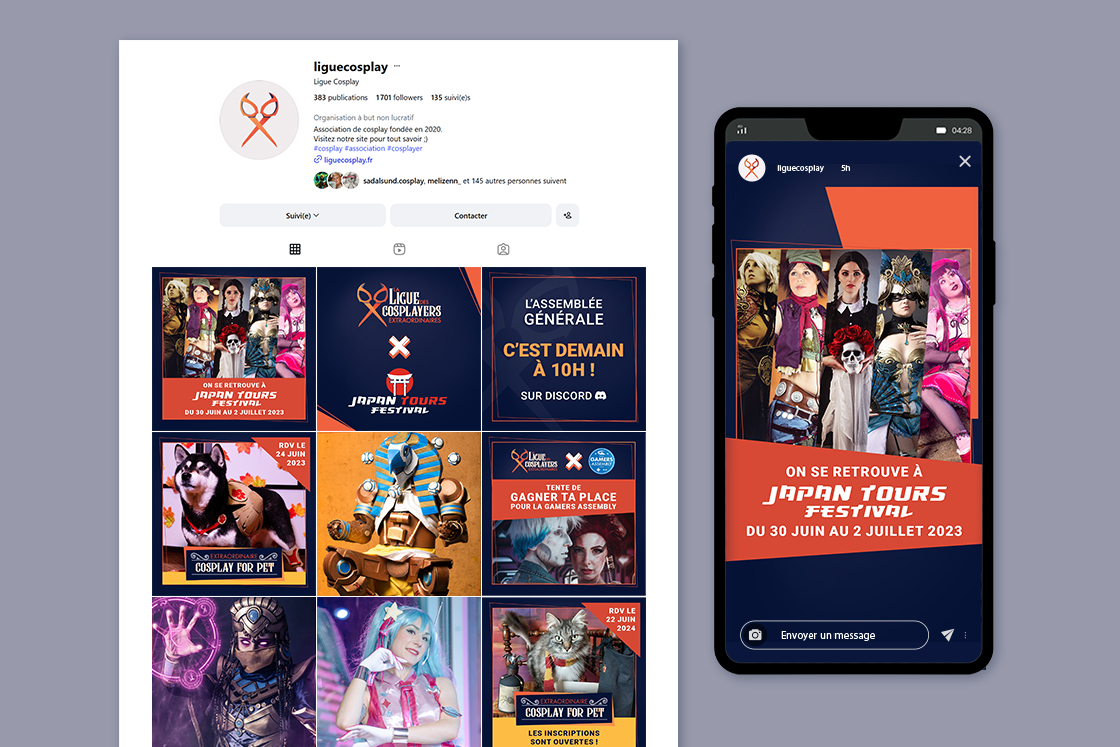 Grâce à cette identité graphique, la Ligue a gagné en visibilité et fait partie des associations les plus importantes du milieu cosplay : son image est désormais reconnue par les amateurs de cosplay en France. De nombreux évènements de pop culture ont fait appel à l’association pour exposer les cosplays de ses membres les plus expérimentés, animer des conférences, faire des démonstrations et organiser des ateliers avec le public. Les templates que j’ai créé pour les réseaux sociaux ont permis aux membres de gagner du temps et de publier leur contenu de manière autonome, renforçant ainsi la visibilité de l’association.