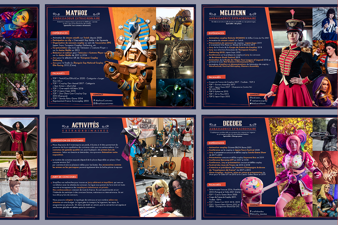 L’univers du cosplay étant très visuel, le book de présentation de l’association comprend de nombreuses photos pour mettre en avant le travail de ses membres. Les illustrations respectent l’univers graphique et permettent d’harmoniser la communication.