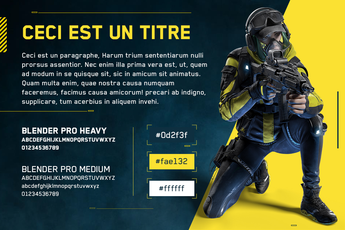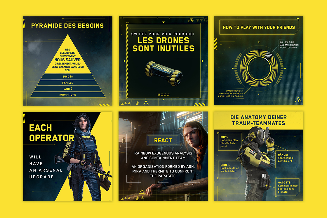 Les posts Instagram sont créés en respectant la charte graphique et l’UI tech SF de Rainbow Six. Pour capter l’attention les posts avec visuels des personnages sont alternés avec des posts contenant que du texte ou des captures de jeu. Chaque post est localisé en anglais, allemand et français.