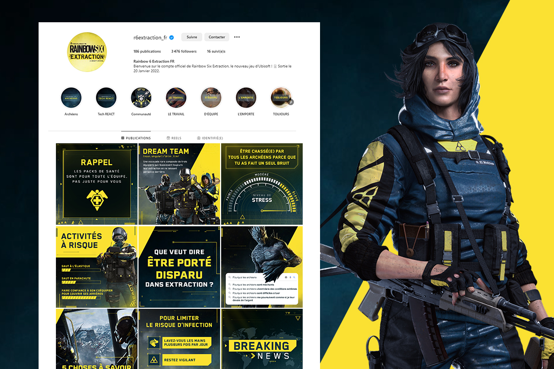 Création de posts pour les réseaux sociaux en collaboration avec l’agence Biborg pour la promotion du jeu vidéo Rainbow 6 Extraction du studio Ubisoft. Ces posts ont été mis en ligne sur plusieurs mois pour rappeler la date de sortie du jeu et informer sur son contenu.