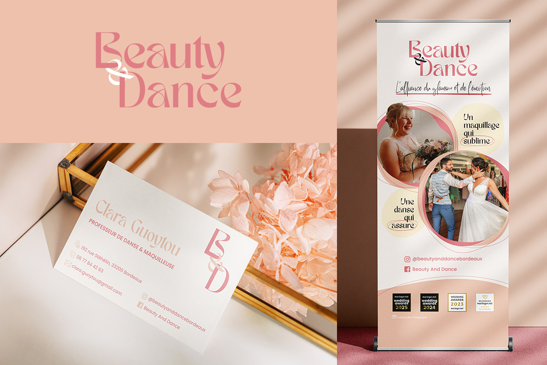 J’ai accompagné Clara à retravailler son message. Ensemble nous avons déterminé les dénominateurs communs entre la danse et le maquillage. Les deux prestations s’adressent aux futurs marié avec la promesse d’un gain de confiance en soi à travers une ouverture de bal maîtrisée et d’un maquillage réussi. Glamour, fun et confiance en soi résument l’expérience Beauty & Dance.
