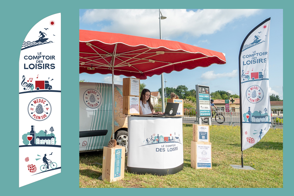 Médoc Plein Sud est un office de tourisme itinérant et mobile qui accueille les visiteurs à bord de son camion, la Pignotte. L’identité graphique du Comptoir des Loisirs est déclinée sur un comptoir d’accueil et des flammes, rapides à déployer lorsque l’OT s’installe sur les marchés.