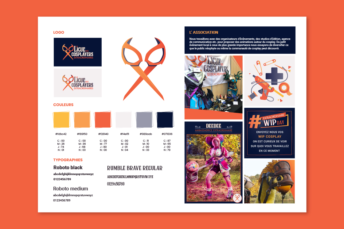L’univers du cosplay étant très visuel, le book de présentation de l’association comprend de nombreuses photos pour mettre en avant le travail de ses membres. Les illustrations respectent l’univers graphique et permettent d’harmoniser la communication.